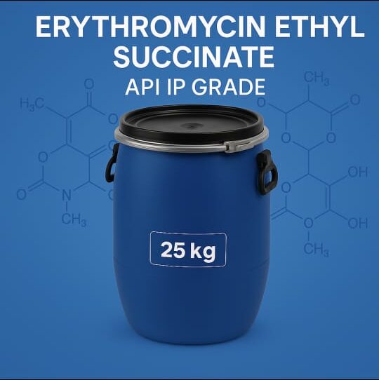 Erythromycin Ethyl Succinate (API IP Grade) is a premium-quality macrolide antibiotic active pharmaceutical ingredient (API) designed to meet Indian Pharmacopoeia standards. It is a prodrug of Erythromycin that becomes active upon hydrolysis in the body, offering enhanced stability and improved gastrointestinal tolerance. Widely used in the formulation of oral suspensions, tablets, and capsules, this API is effective against a broad spectrum of bacterial infections, including respiratory, skin, and soft tissue infections. Its high purity, consistent particle size, and superior solubility make it ideal for pharmaceutical manufacturing and global export.
